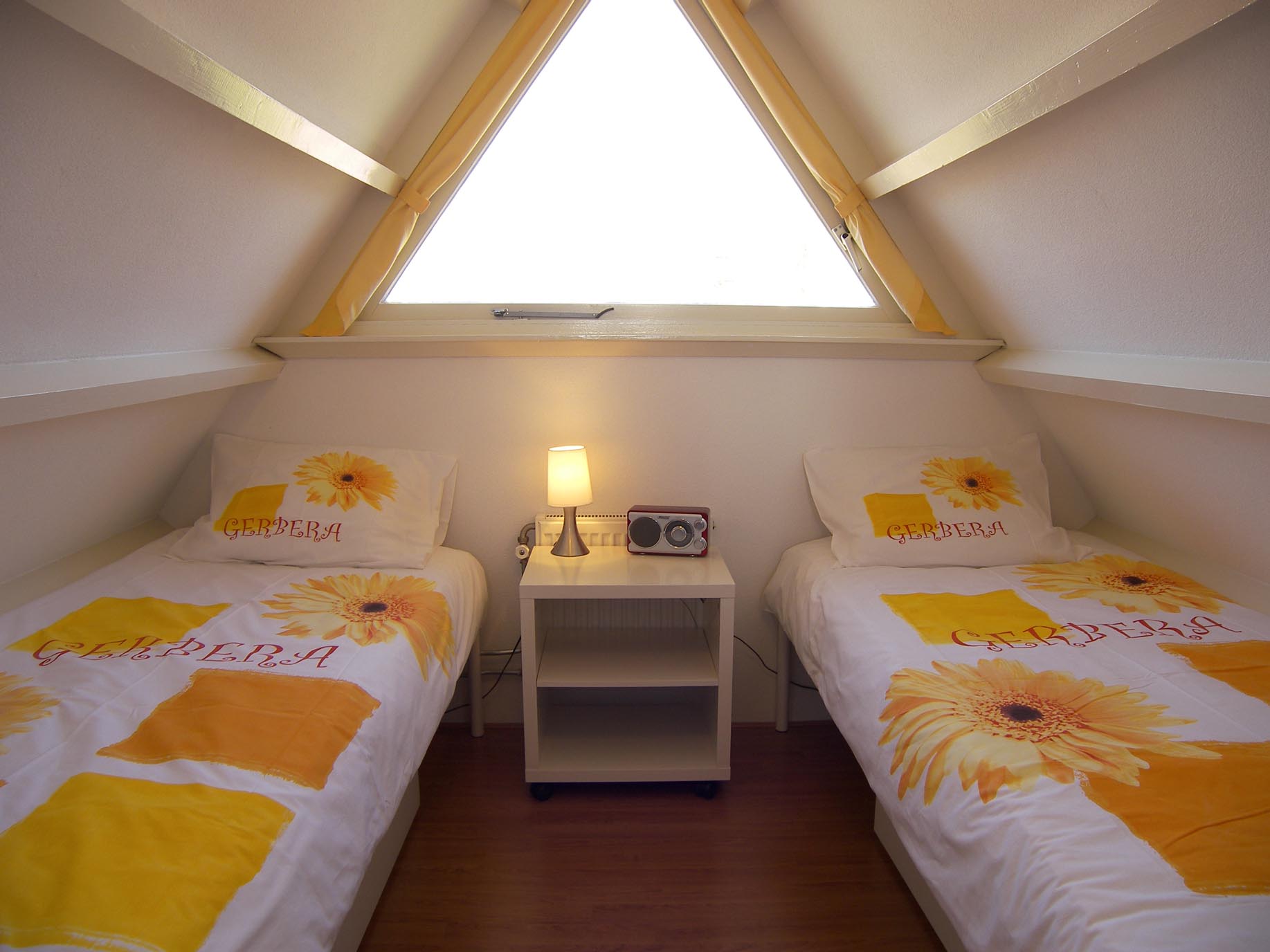 Schlafzimmer 1 befindet sich im Erdgeschoss und verfügt über ein 2-Personen-Auping-Bett mit zwei separaten 80x200cm-Matratzen. Hier hängen auch ein kleiner Fernseher und ein Kleiderschrank.